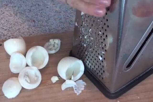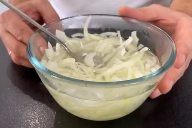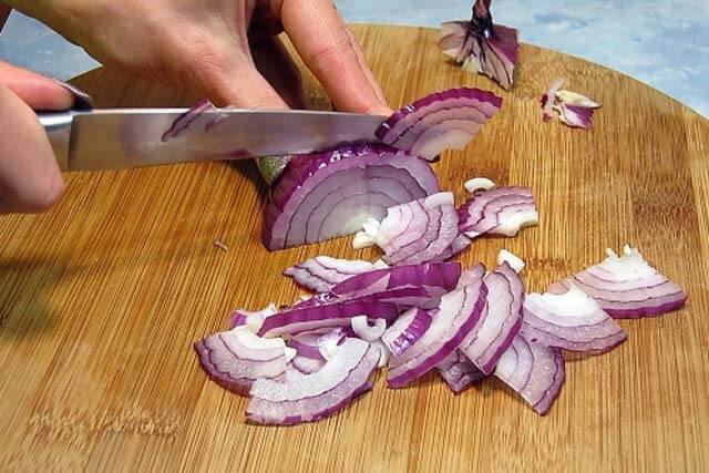- Порезать репчатый лук четвертинками колец, залить горячей водой, оставить на несколько минут.