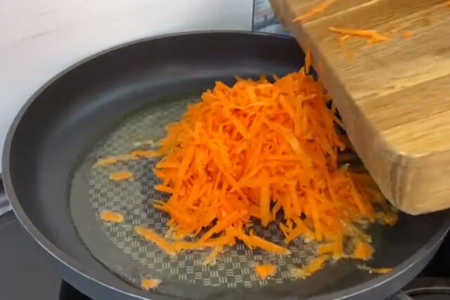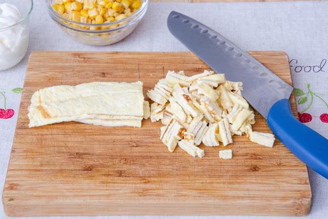 - Остудить яичный блин, порезать на кусочки соломкой.