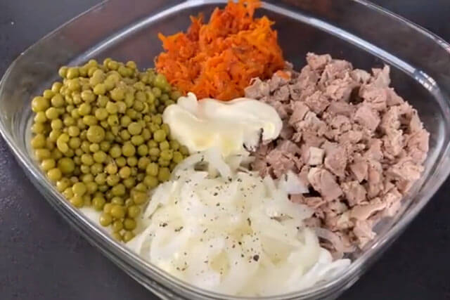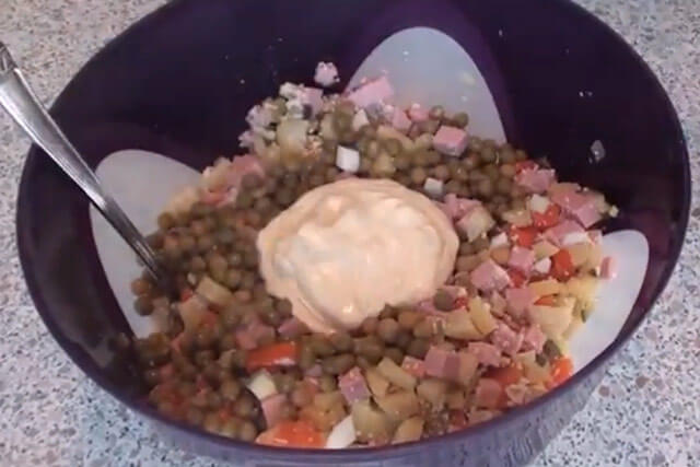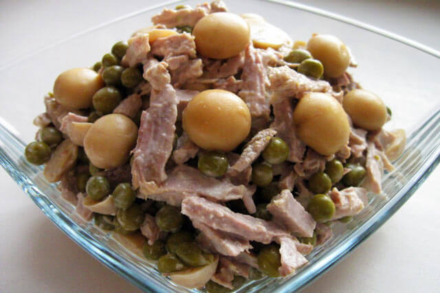 - Смазать мясо майонезом, далее выложить слой консервированного горошка.