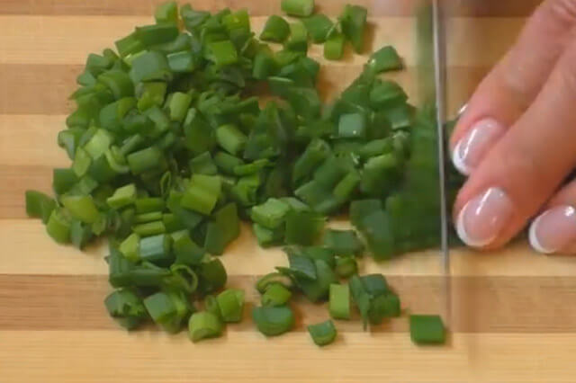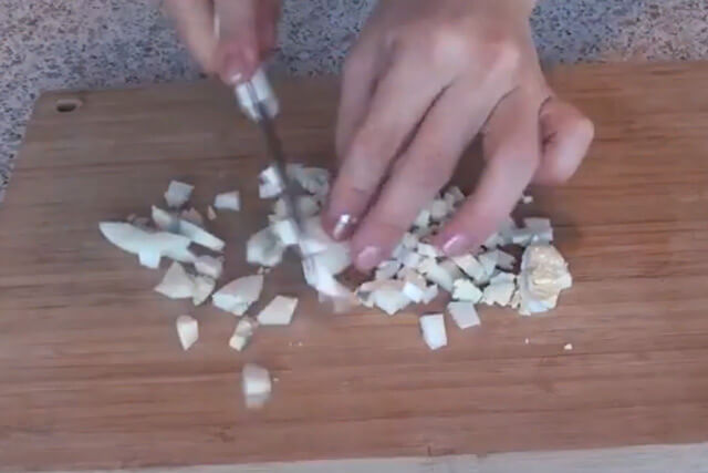 - Такой же нарезкой измельчить яйца, не превращая их в кашу.
