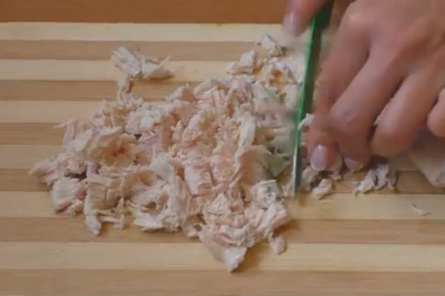- Филе курицы отварить, остудить, разобрать на волокна.