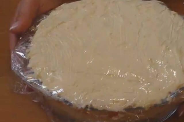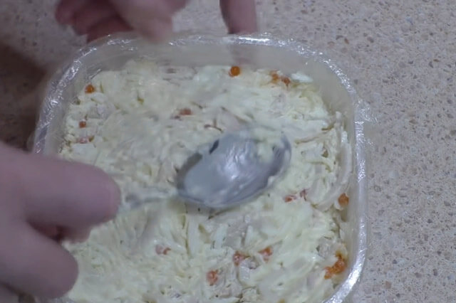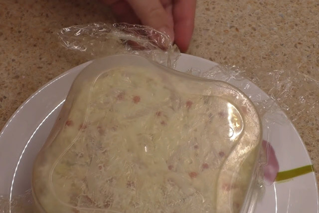 - Переложить салат в контейнер, дно которого застелено пищевой пленкой, разровнять.