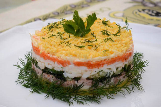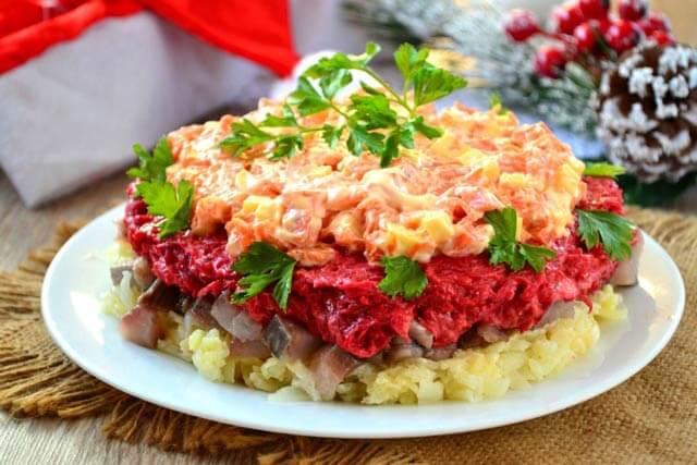 Это вариация салата «Селедка под шубой», которая полюбилась уже многим любителям рыбных угощений.