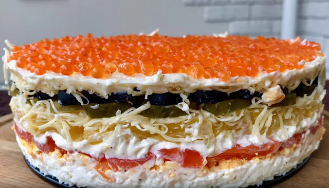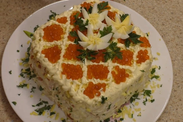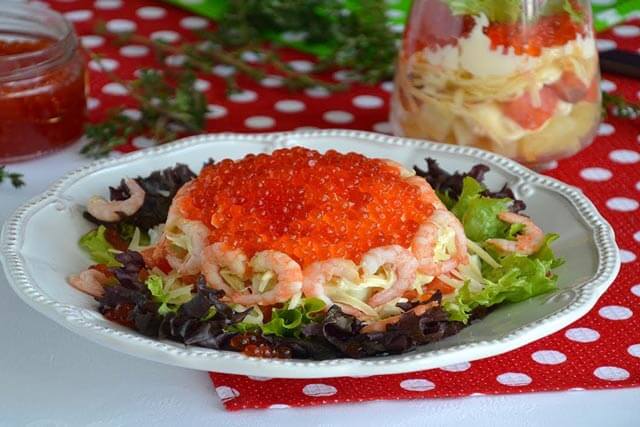 - Перед подачей на верхушку выложить красную икру. Желательно не смешивать ее с салатом, чтобы икринки не полопались.