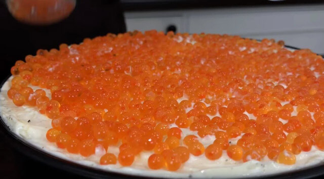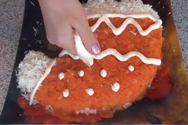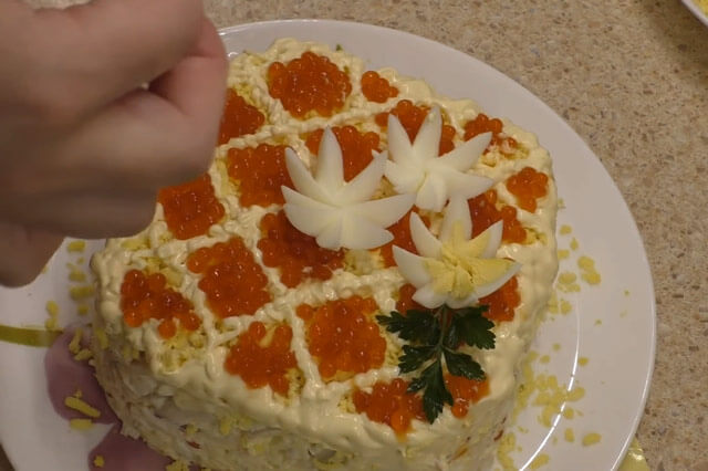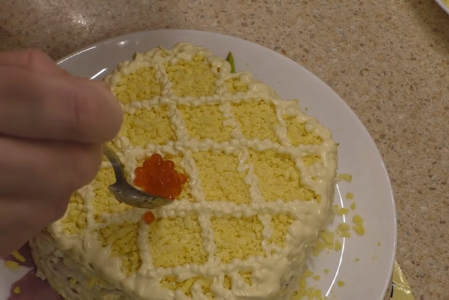 - Сверху нарисовать майонезную сетку, выложить икринки, украсить зеленью, цветочками из яичных белков.