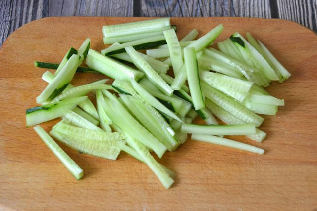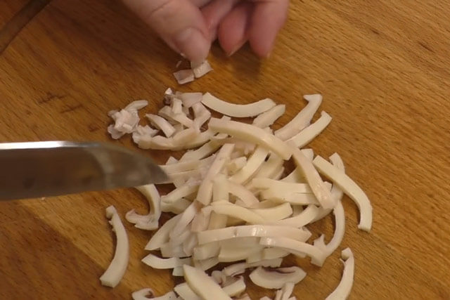 - Остывшее мясо кальмаров нарезать некрупной соломкой.