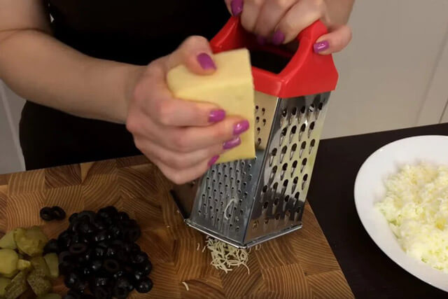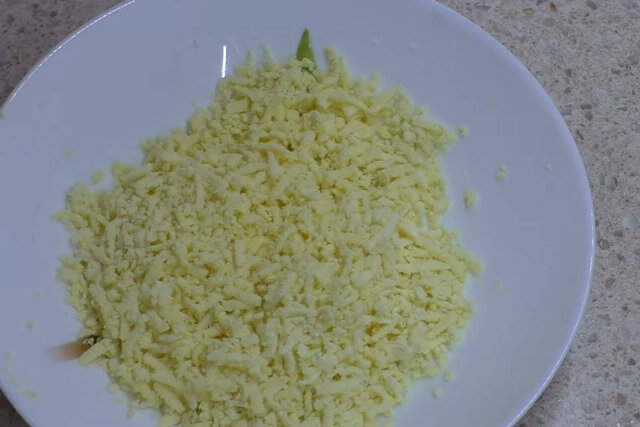 - Разделить белки и желтки вареных яиц, натереть их по отдельности на мелкой терке.