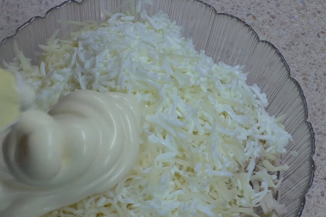 - Сыр, кальмары и белки смешать в салатнике и заправить майонезом.