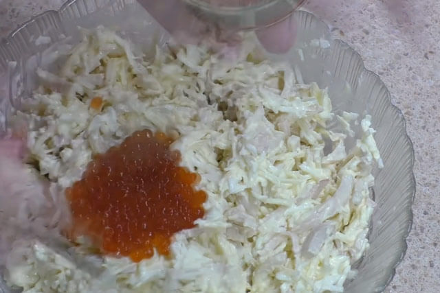 - Добавить икру и пару раз перемешать ее ложкой в салате так, чтобы она не полопалась.