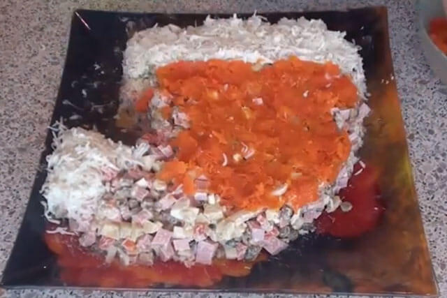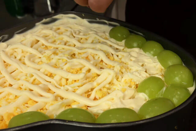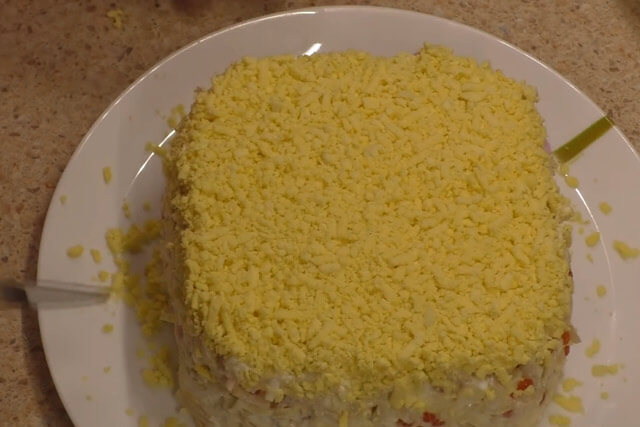 - Разровнять салат в блюде, верхушку слегка смазать майонезом и покрыть желтком.