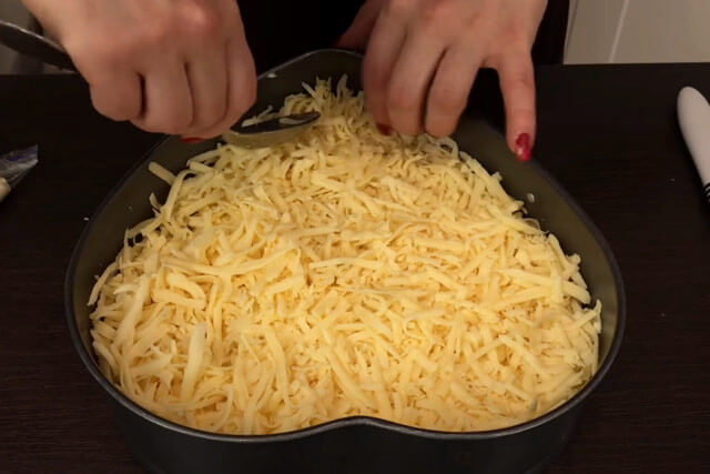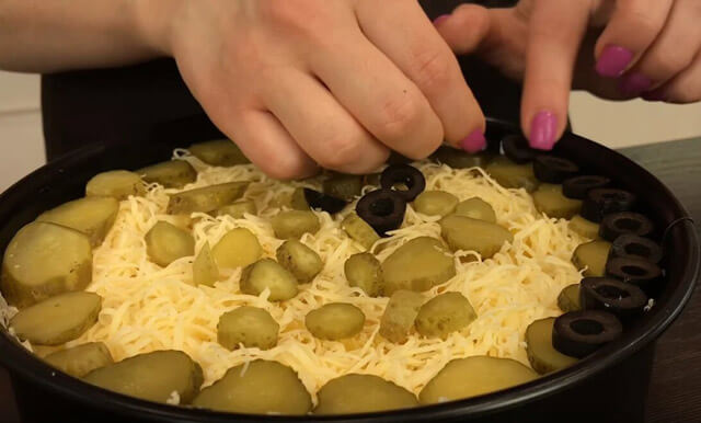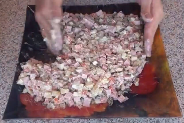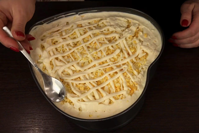 - Обмазать блюдо сверху хорошим слоем майонеза.