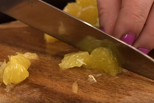 - Мандарины очистить, разобрать на дольки, убрать семечки, порезать на части каждую дольку.