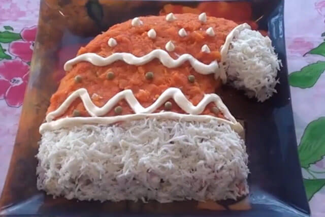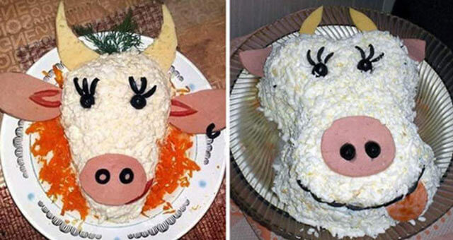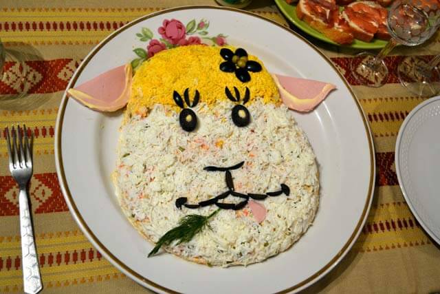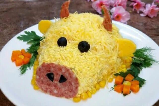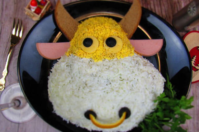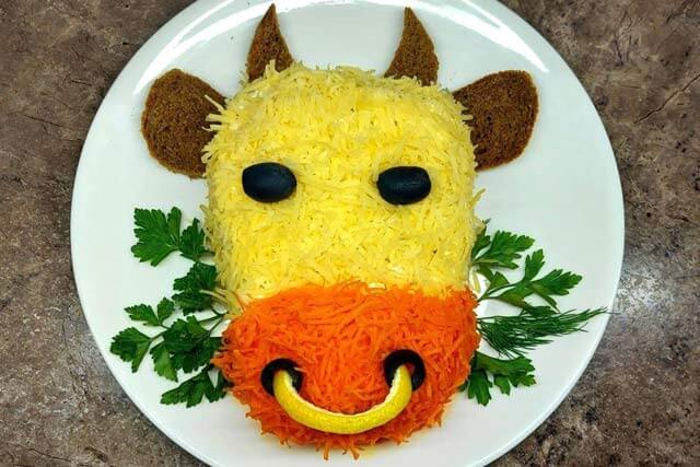 Отлично впишется на праздничном столе салат в виде быка на Новый год 2021. При тщательном оформлении он может стать главным украшением застолья.