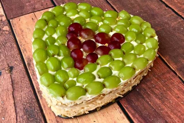 - Выложить ингредиенты на плоское блюдо или в форму слоями: курица, грецкий орех, сыр.
