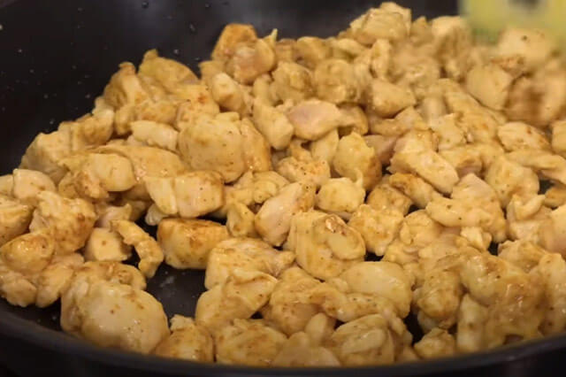 - Куриное филе порезать на небольшие кусочки, смешать со специями и обжарить на растительном масле. Излишки масла убрать салфеткой.