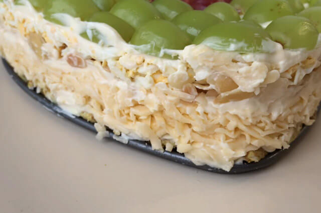 - Выложить ингредиенты в салатник слоями, не забывая промазывать их майонезом: белки, желтки, красная рыба, апельсины, половина тертого сыра, огурцы, маслины, оставшийся сыр.