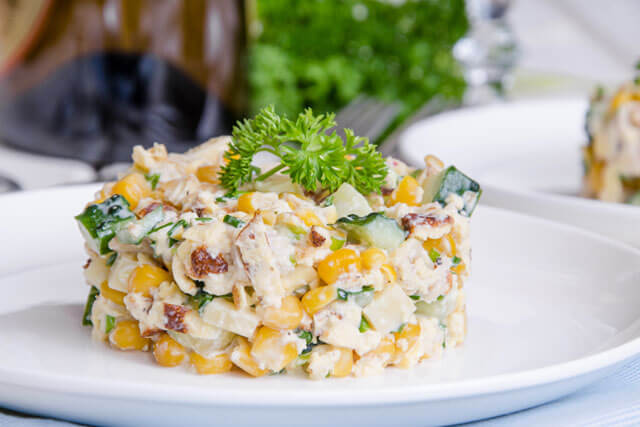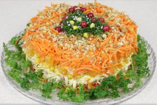 - Выложить салат в широкое блюдо слоями в такой последовательности: половина моркови по-корейски, майонез, половина грецких орехов, курица, майонез, сыр, кукуруза, майонез, мандарины, оставшаяся часть моркови и орехов.