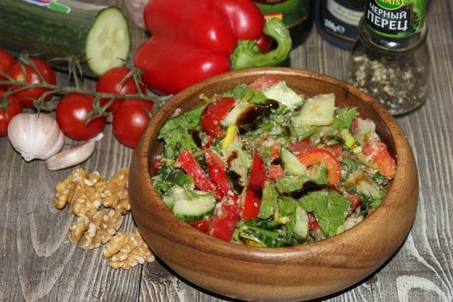 - Смешать все ингредиенты в салатнике, заправить растительным маслом и соком лимона.