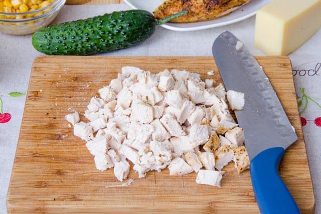 - Курицу отварить, остудить и нарезать мелким кубиком.