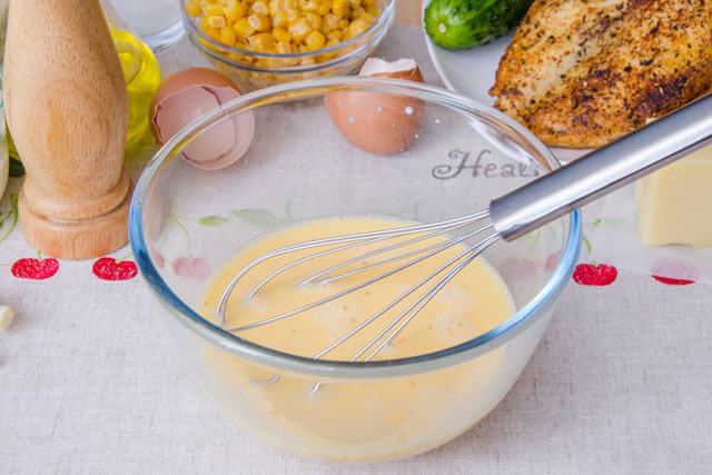 - Разбить яйца в миску, добавить соль, хорошо взбить.